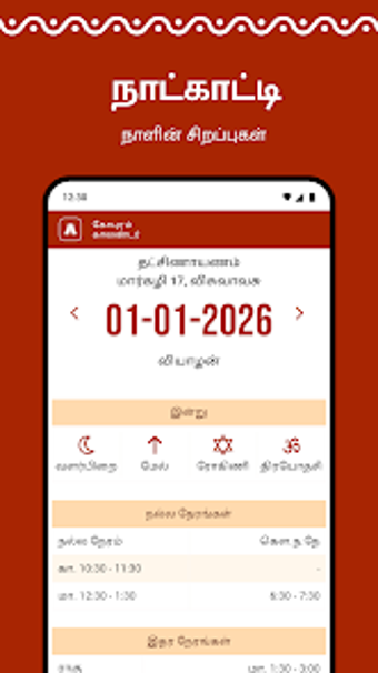 ゴプラムタミルカレンダー2026は、タミルユーザーが日々のパンチャンガと吉日を利用できるように設計された効率的なモバイルアプリケーションです。オフラインアクセスを可能にするユーザーフレンドリーなインターフェースを備えており、日常使用に便利です。ユーザーは、今日と明日のパンチャンガの詳細を簡単に見つけることができ、ナラネーラム、ラフーカラム、ヤマガンダムを含む日々のマントラには、ヒンドゥー教の神々に捧げられたさまざまな賛美歌や祈りが含まれています。